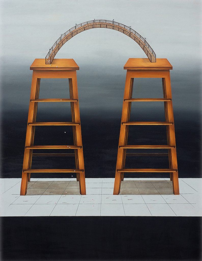 In the paintings, the broken chimes transmogrify into hurdles, stilts, anchors and even nunchakus. The